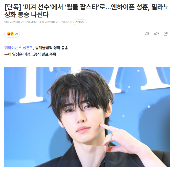 据韩国媒体报道,韩国人气男子组合ENHYPEN成员朴成训将担任2026年米兰-科尔蒂纳丹佩佐冬奥会的火炬手。